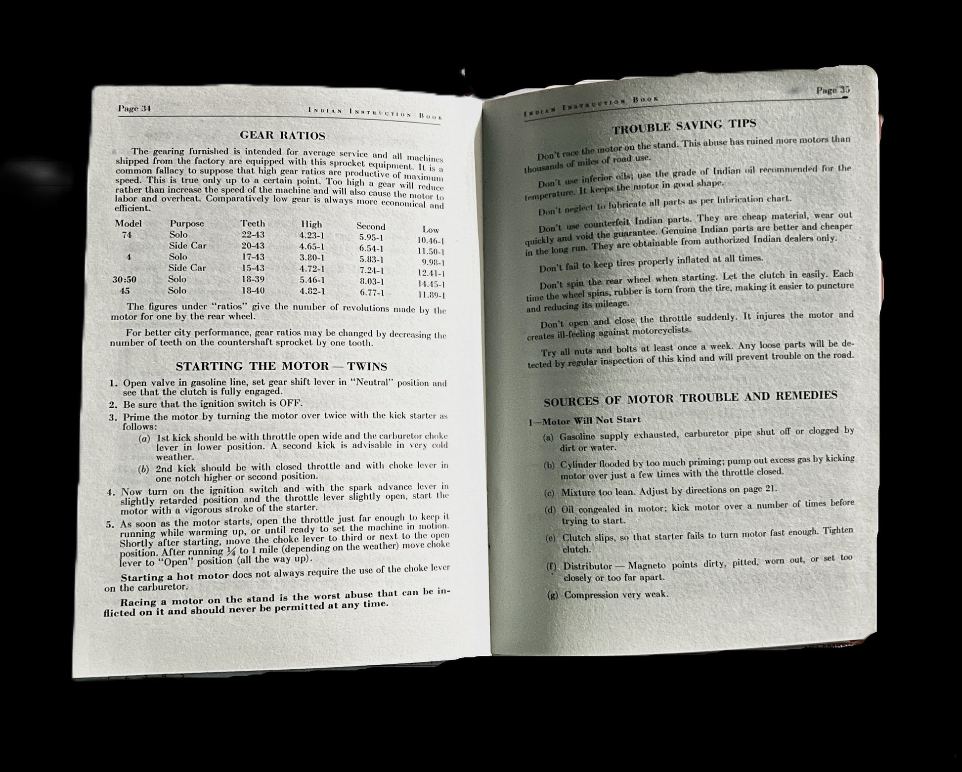 1946-47 Indian Motorcycle riders' instruction booklet. Text covers Indian Seventy-Four, Indian Four, Indian Thirty-Fifty, Indian Forty-Five, Indian Dispatch-Tow. Detailed instructions with diagrams. Softcover. 42 Pages.