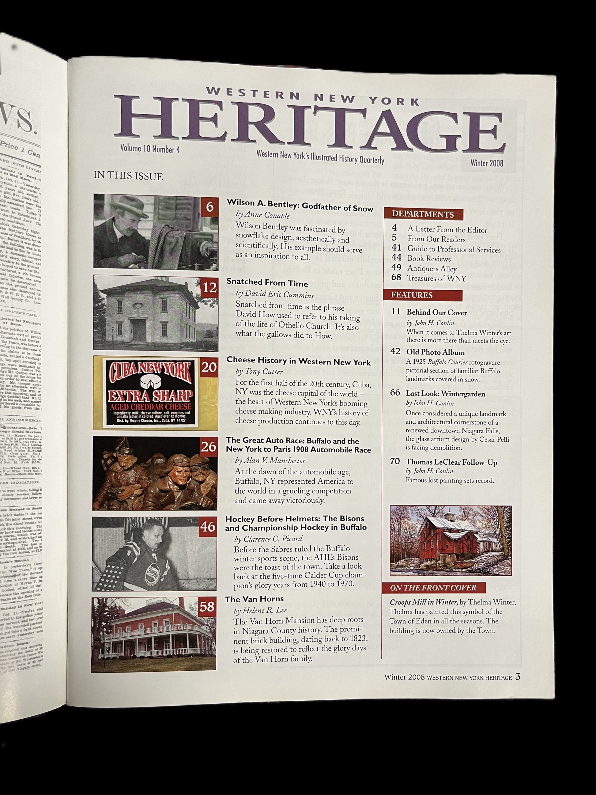The Winter 2008 issue of Western New York Heritage Magazine which features The Great Auto Race: Buffalo and the New York to Paris 1908 Automobile Race by Alan V. Manchester, a 14-page article highlighting the American Thomas Flyer car and team, including a full color map of the race route and photos. Additional articles in this issue include: